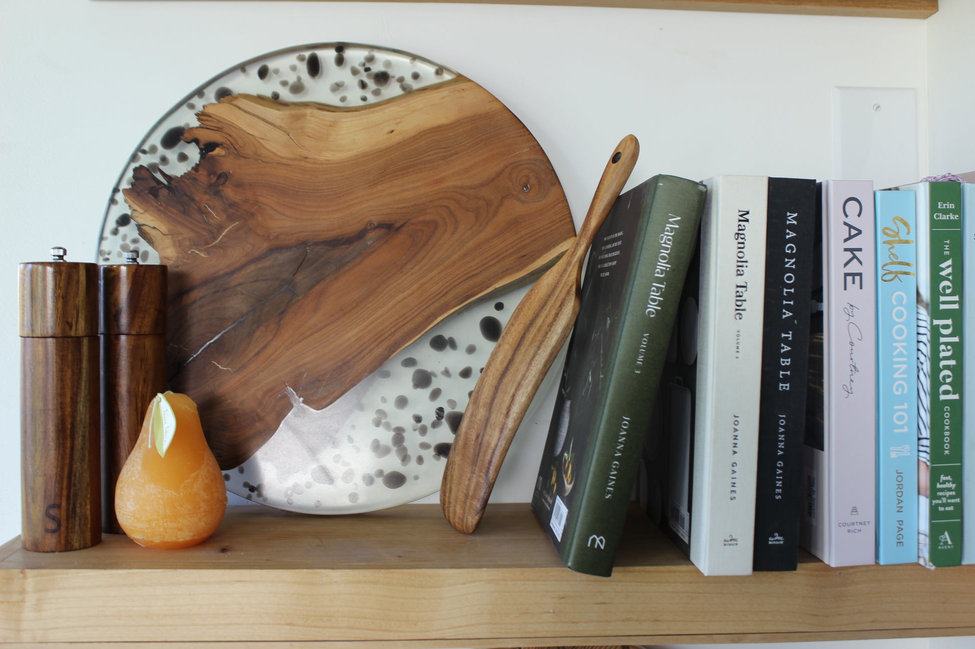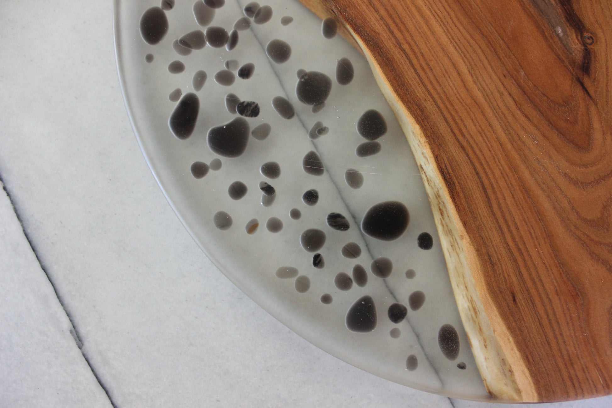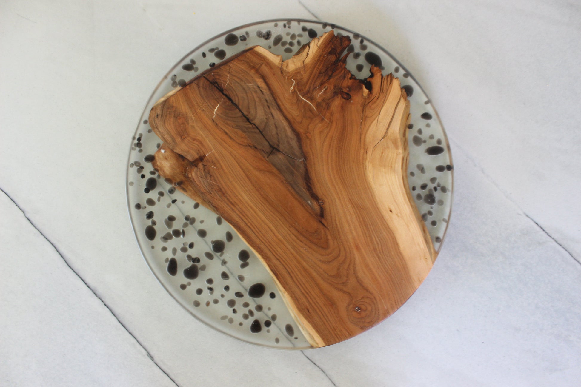 Striking in its simplicity and rich in natural beauty, our Circular Wood & Apache Tear Resin Board is a one-of-a-kind piece that celebrates earth’s raw elements. At the heart of this design is a gorgeous slab of natural wood, its organic grain and shape preserved and elevated by a layer of crystal-clear resin.