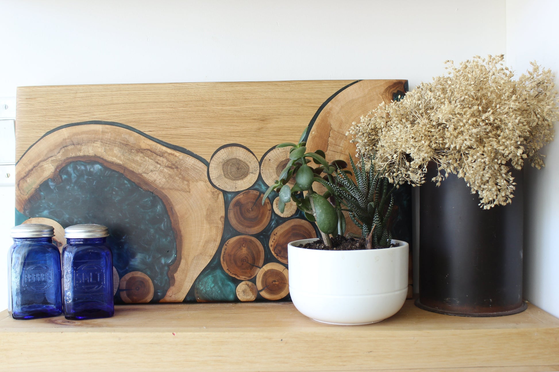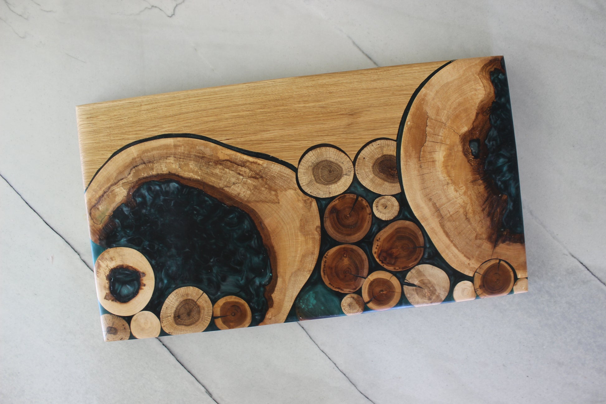Artful and eye-catching, our Wood Disc & Blue Resin Board captures the meeting of raw nature and modern design. Dozens of cross-cut wood discs are suspended in a vivid blue resin, creating the look of floating islands within a shimmering river. The contrast of natural growth rings and bold color makes this piece a true statement for any table.