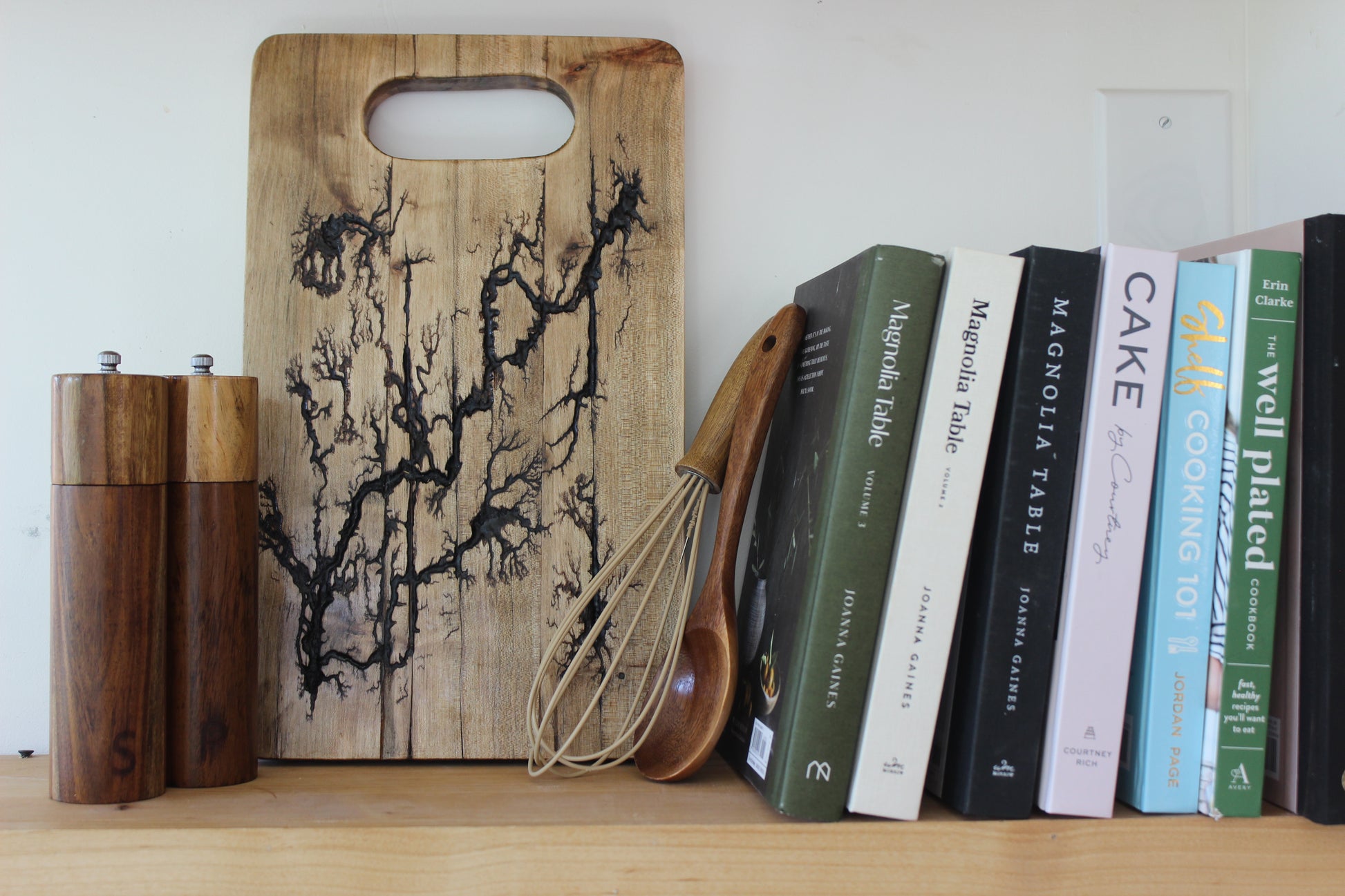 Functional and artful, our Electric Burn Handle Board brings natural beauty to everyday use. Crafted from solid hardwood, this board features a smooth cutout handle for easy carrying and serving. Across its surface, electricity leaves behind striking, tree-like burn patterns that accentuate the organic flow of the wood grain.