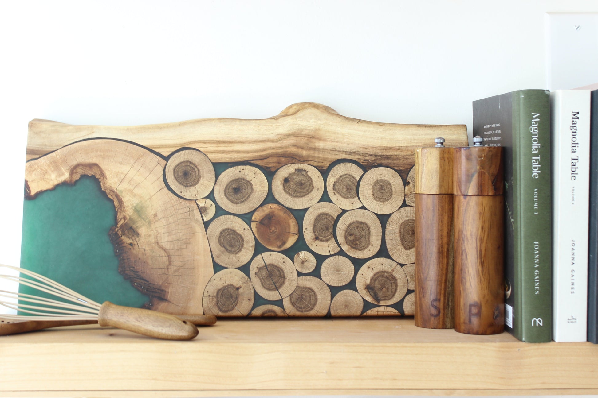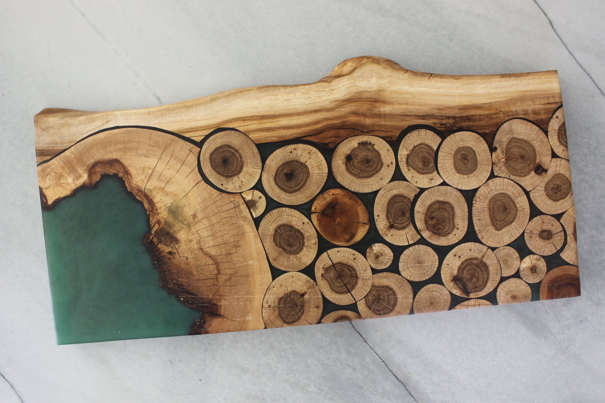 Artful and striking, our Blue-Green Resin & Wood Disc Board captures the beauty of nature in motion. Countless small wood discs are suspended in a flowing blue-green resin. The blend of earthy texture and vivid color makes this piece a captivating accent for any gathering.